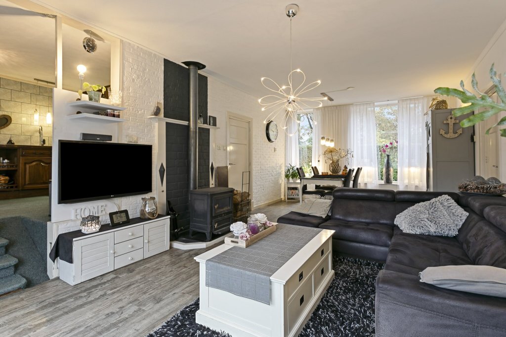 Entrance / hall with meter cupboard and toilet with washbasin, 3 bedrooms, living room with daylight and equipped with beautiful PVC floor, wood stove and sliding doors to a terrace behind the house, the kitchen is split-level with various built-in appliances.