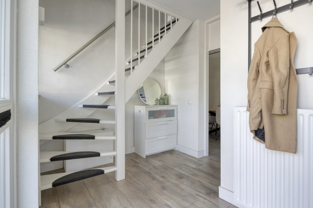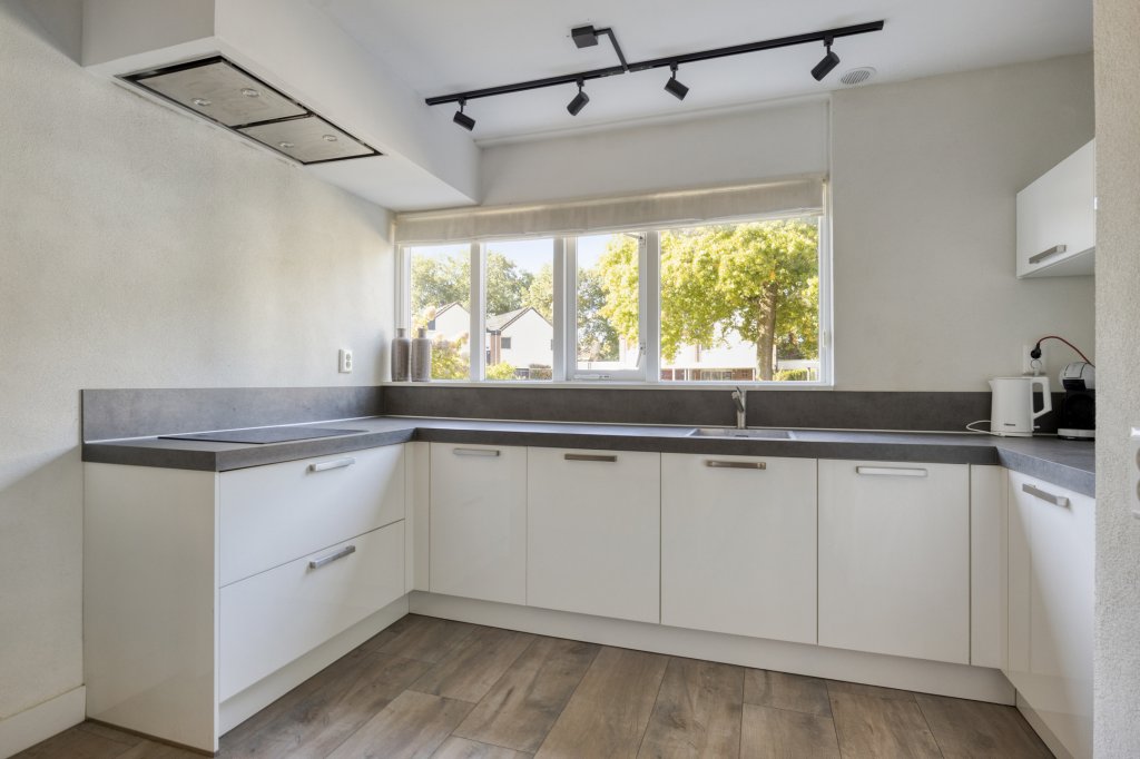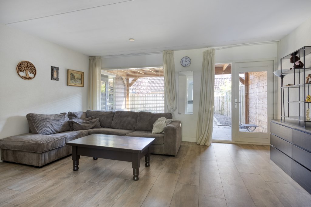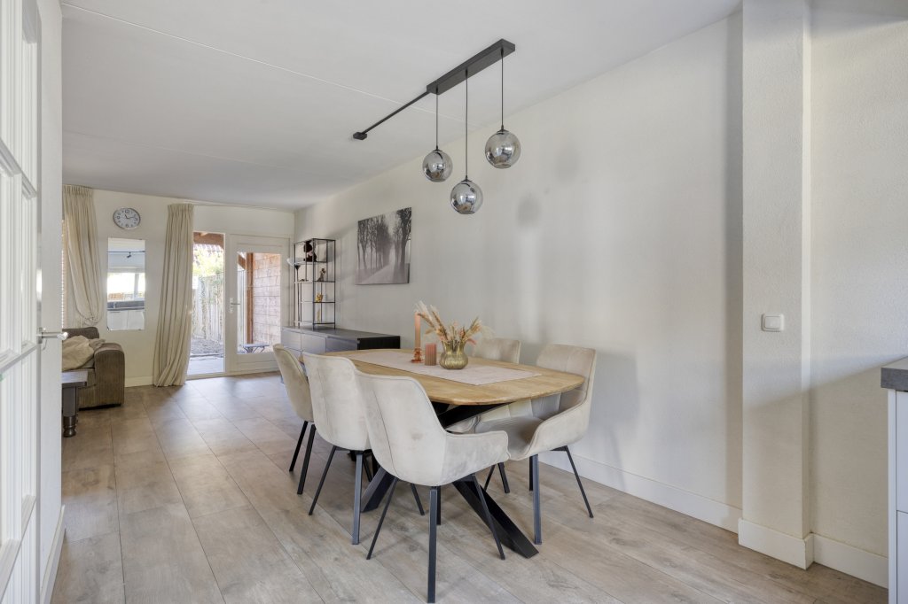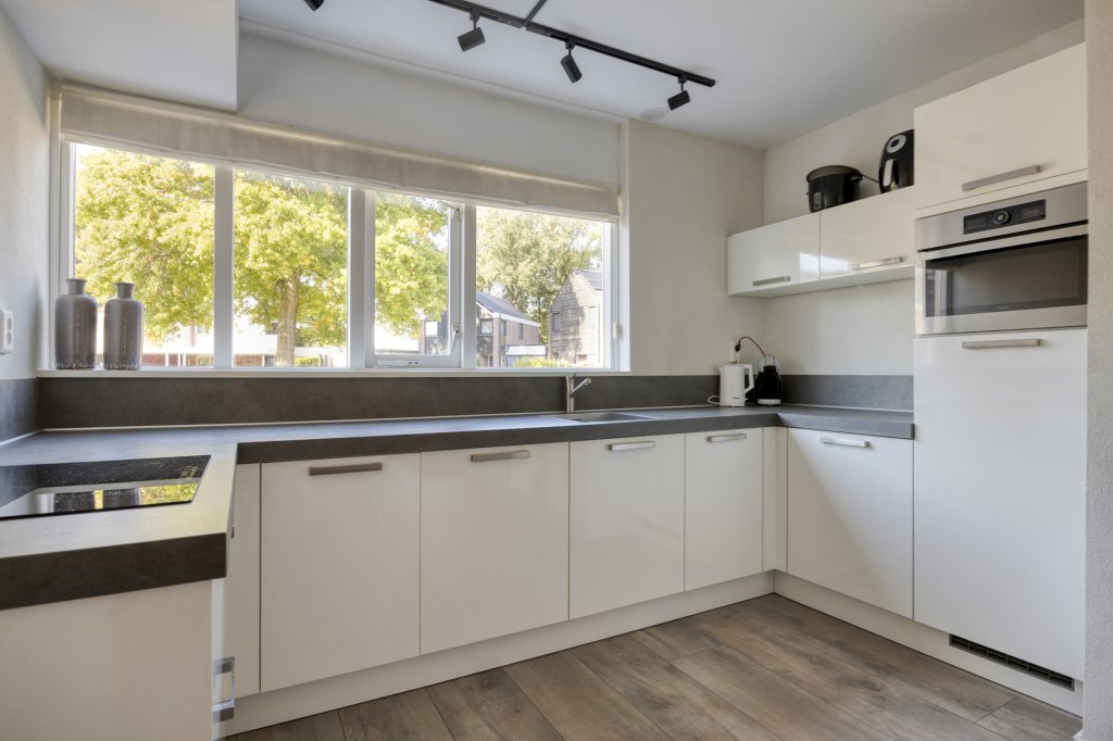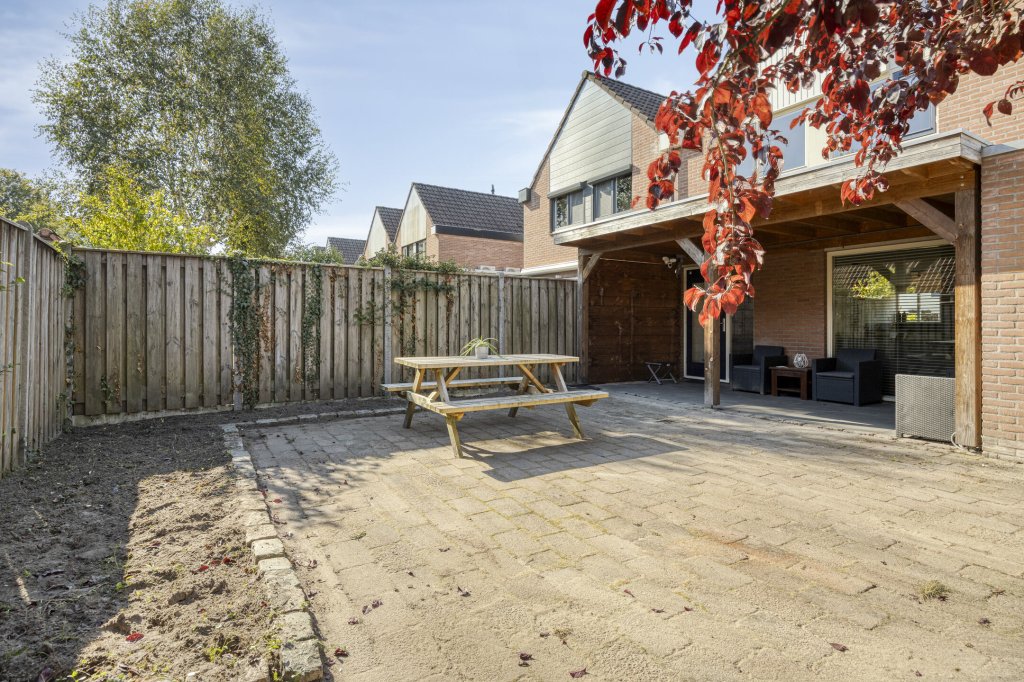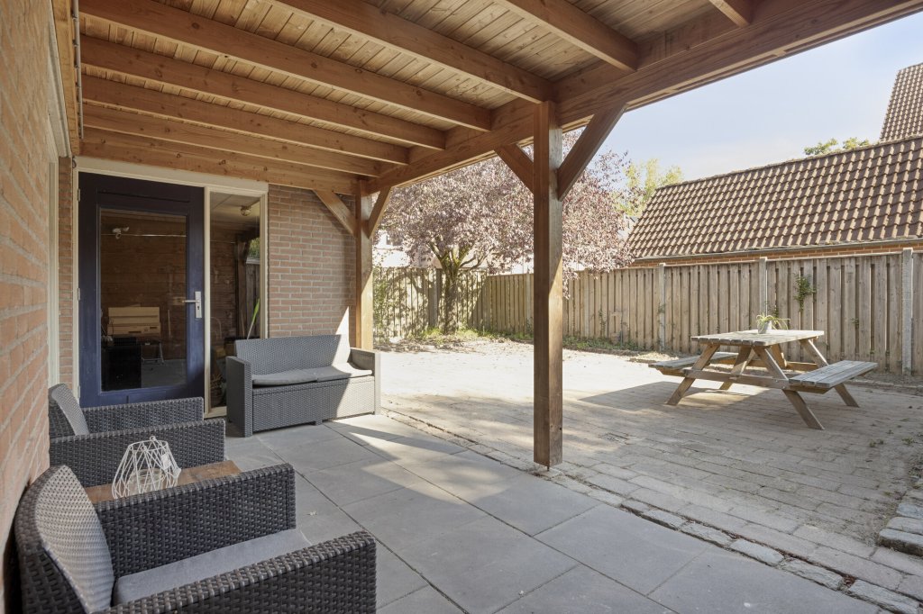 Entree met royale hal en moderne toilet. Ook is hier de trapopgang te vinden. De moderne, open keuken bevindt zich aan de voorzijde van de woning. Deze beschikt onder andere over een combimagnetron, koelkast, inductie kookplaat en vaatwasser. Verder is er voldoende werkruimte in deze keuken. De woonkamer is aan de achterzijde gesitueerd. Door de grote raampartij kijk je uit over de tuin en heeft het leefgedeelte veel lichtinval. Vanuit de woonkamer is de tuin bereikbaar die gelegen is op het oosten. Wat hier direct opvalt is de fijne overkapping die in het verlengde van de woning gesitueerd is. De tuin is lekker ruim, waardoor er altijd wel een zonnig plekje te vinden is. Tevens is er een royale garage, die bereikbaar is vanuit de achtertuin en vanaf de voorzijde.