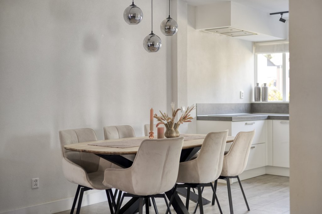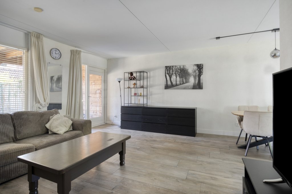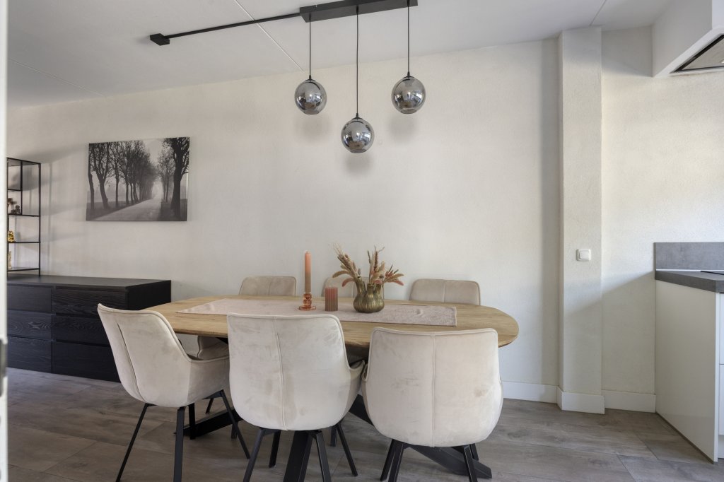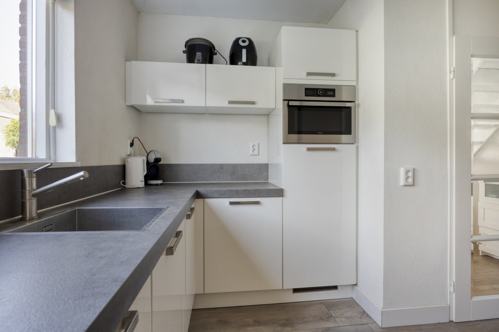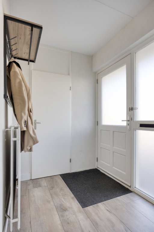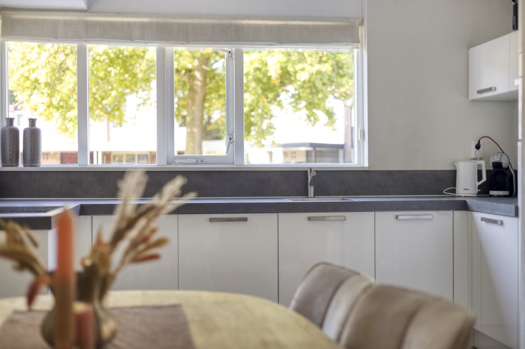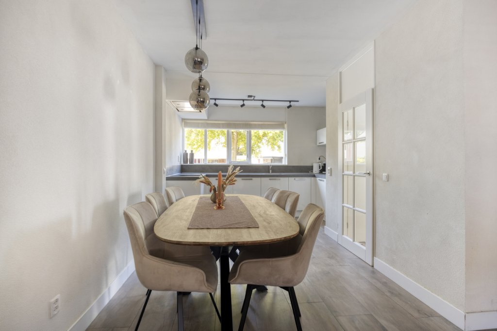 Entree met royale hal en moderne toilet. Ook is hier de trapopgang te vinden. De moderne, open keuken bevindt zich aan de voorzijde van de woning. Deze beschikt onder andere over een combimagnetron, koelkast, inductie kookplaat en vaatwasser. Verder is er voldoende werkruimte in deze keuken. De woonkamer is aan de achterzijde gesitueerd. Door de grote raampartij kijk je uit over de tuin en heeft het leefgedeelte veel lichtinval. Vanuit de woonkamer is de tuin bereikbaar die gelegen is op het oosten. Wat hier direct opvalt is de fijne overkapping die in het verlengde van de woning gesitueerd is. De tuin is lekker ruim, waardoor er altijd wel een zonnig plekje te vinden is. Tevens is er een royale garage, die bereikbaar is vanuit de achtertuin en vanaf de voorzijde.