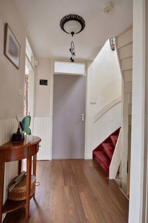 In de hal bevindt zich een voorraadkelder met houten trapje naar beneden.