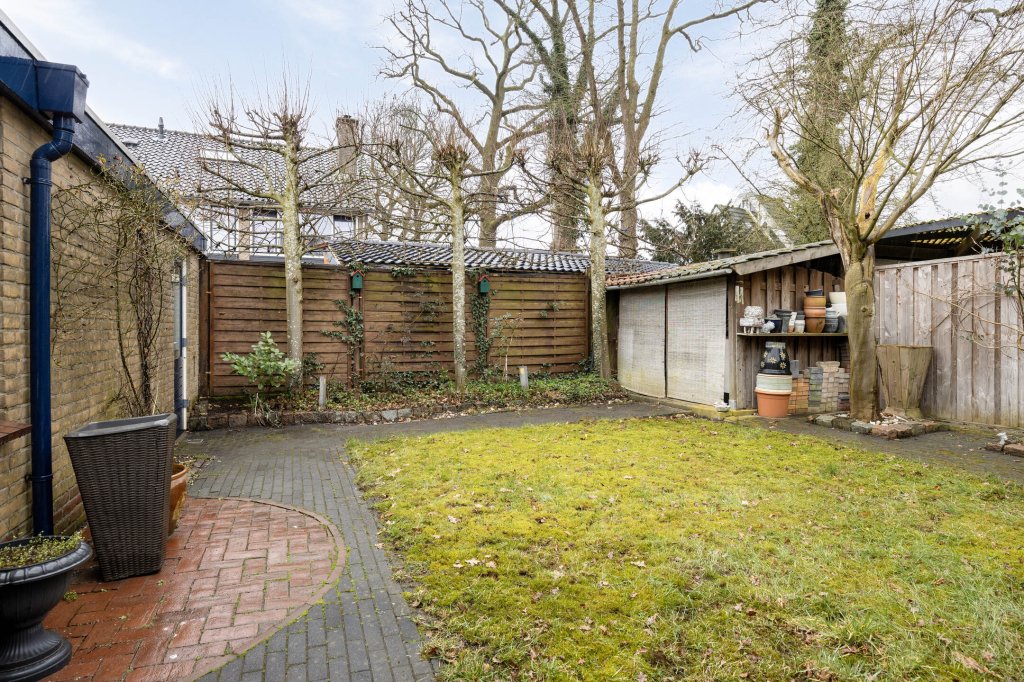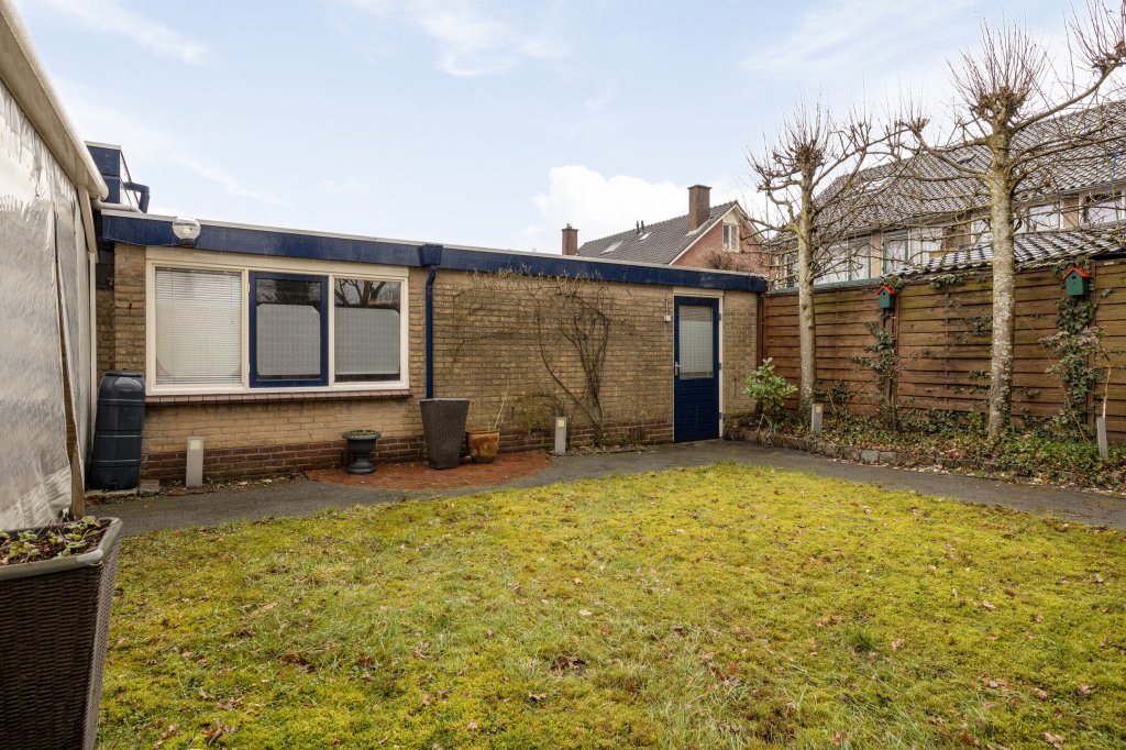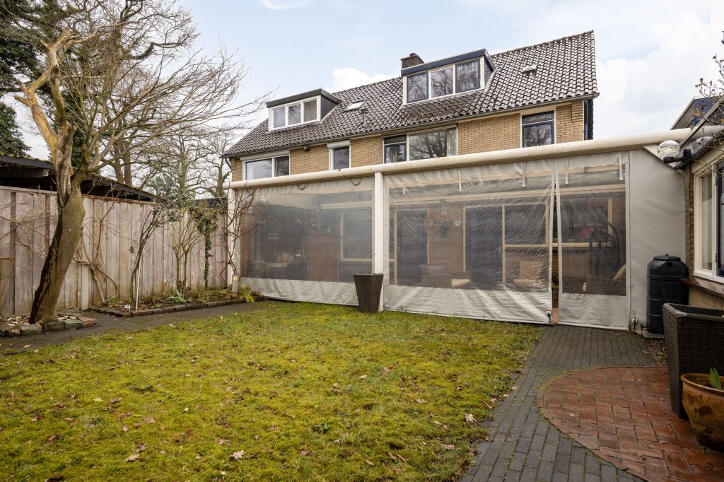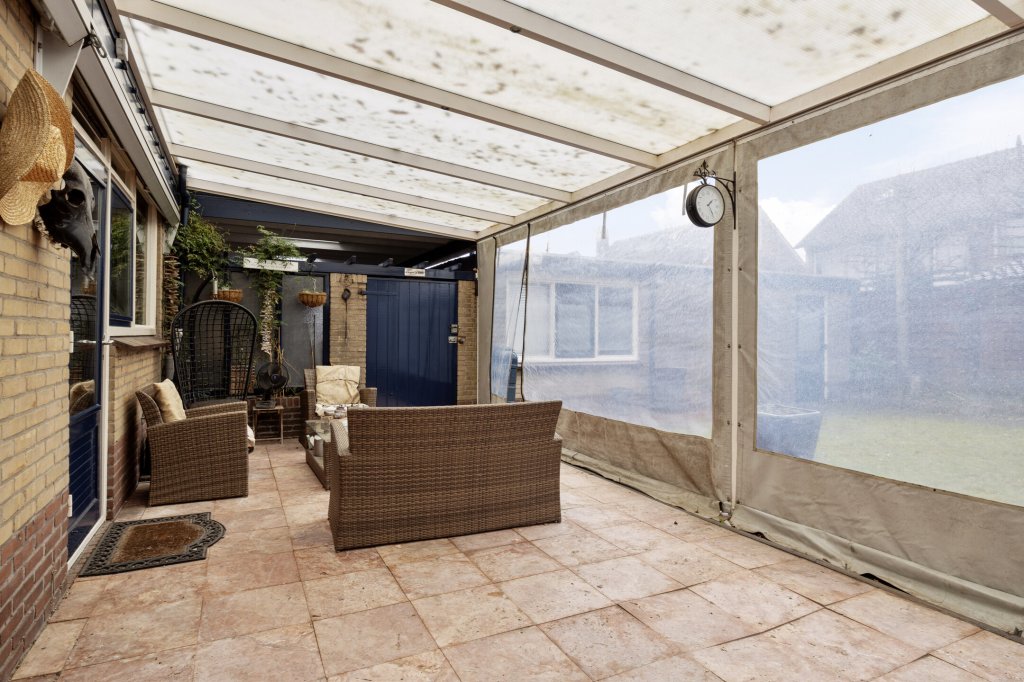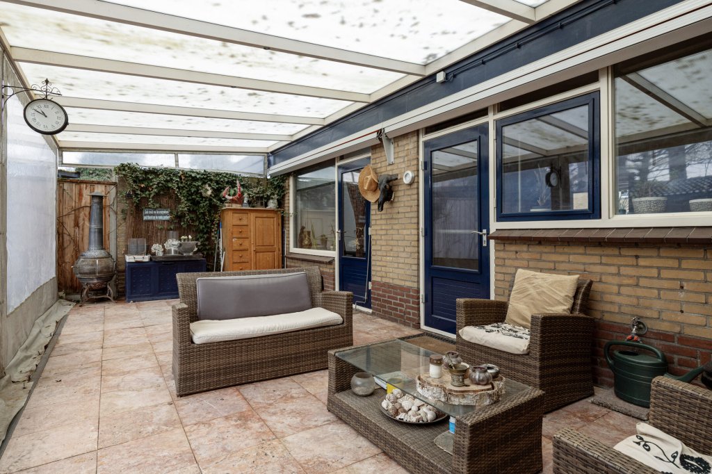 Direct aan de keuken bevindt zich, over de gehele achtergevel van de woning, een gezellige overkapping.