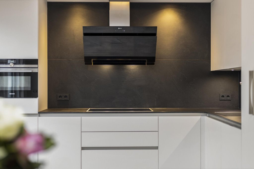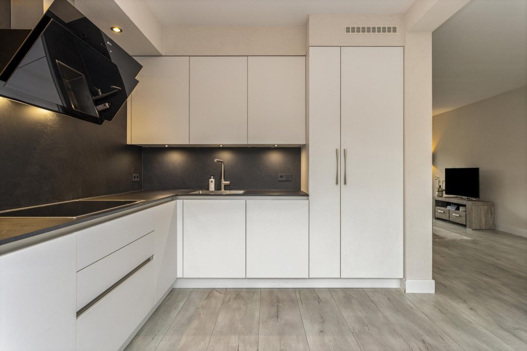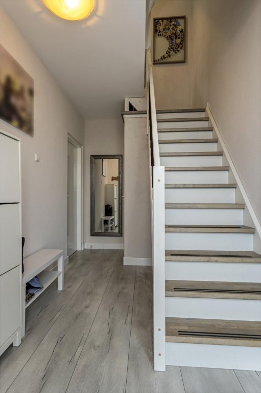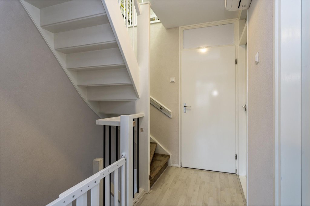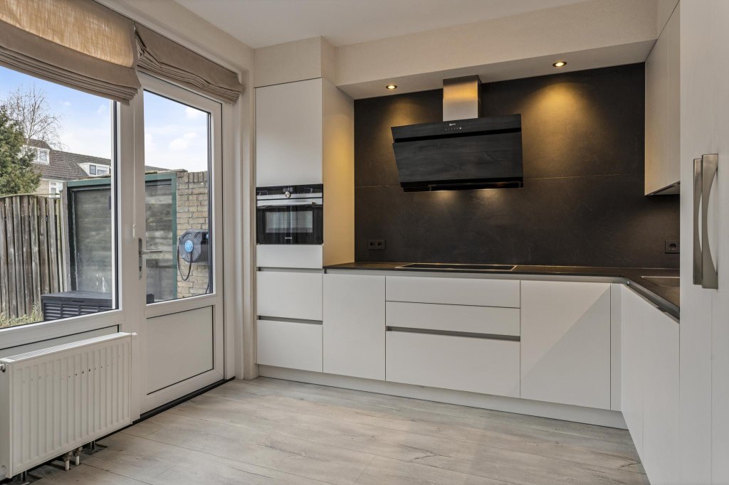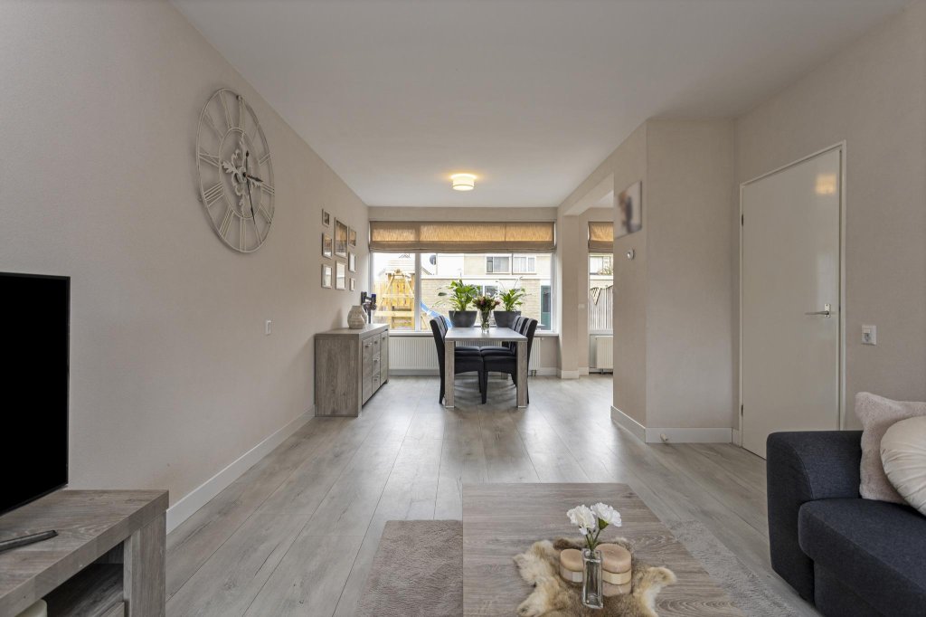 De ruime hal biedt toegang tot de toilet, meterkast en trapopgang naar de eerste verdieping. Via de hal komen wij in een ruime open woonkamer met luxe laminaatvloer en open keuken. De keuken is eind 2018 geplaatst en voorzien van koelkast, inductiekookplaat, wasemkap, oven en vaatwasser. Via de keuken kom je dan in de ruime achtertuin, perfect gelegen op het zuiden, die in 2020 volledig nieuw en onderhoudsvriendelijk is aangelegd.