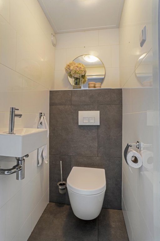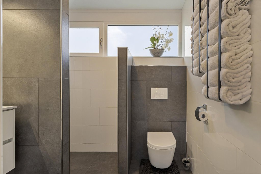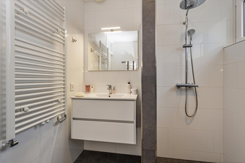 Via de overloop - voorzien van een airco - kom je bij twee ruime slaapkamers, voorzien van rolluiken. Aan de voorzijde van de woning bevindt zich nog een ruime slaapkamer. Via de overloop bereik je ook de moderne badkamer, voorzien van een ruime inloopdouche, wastafelmeubel, toilet en design radiator.