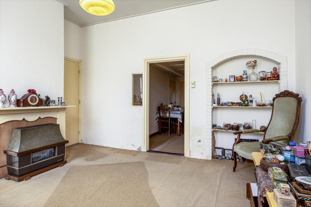 Bij binnenkomst vind je een hal, een trap naar boven, de kelderkast en toegang tot de woonkamer die je naar eigen smaak kunt moderniseren. In de woonkamer is een diepe opbergkast, een dichte keuken. Aan de andere kant van de woning heb je nog een woonkamer met toegang tot ruime bergkast eetkamer en toilet en badkamer, vanuit hier is er ook toegang tot de achtertuin.