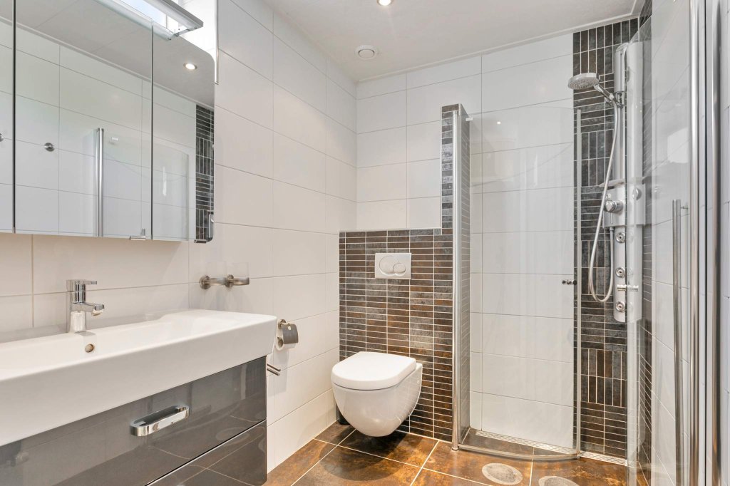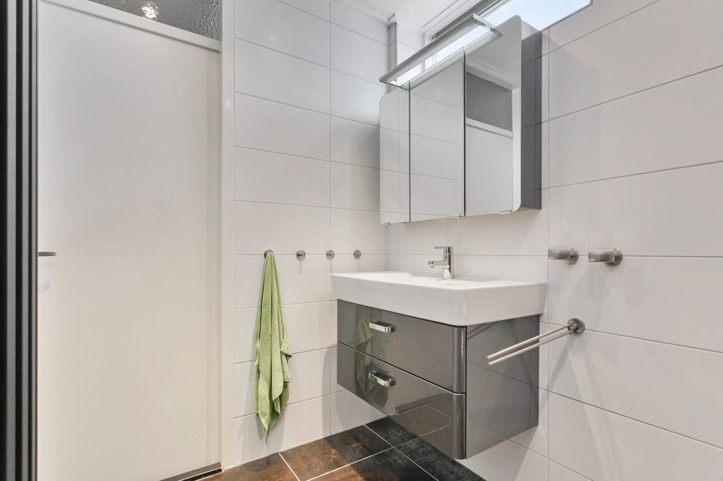Overloop met drie ruime slaapkamers waarvan 1 voorzien van airconditioning, moderne badkamer voorzien van een douche, toilet en wastafelmeubel, vaste trap die toegang geeft tot..