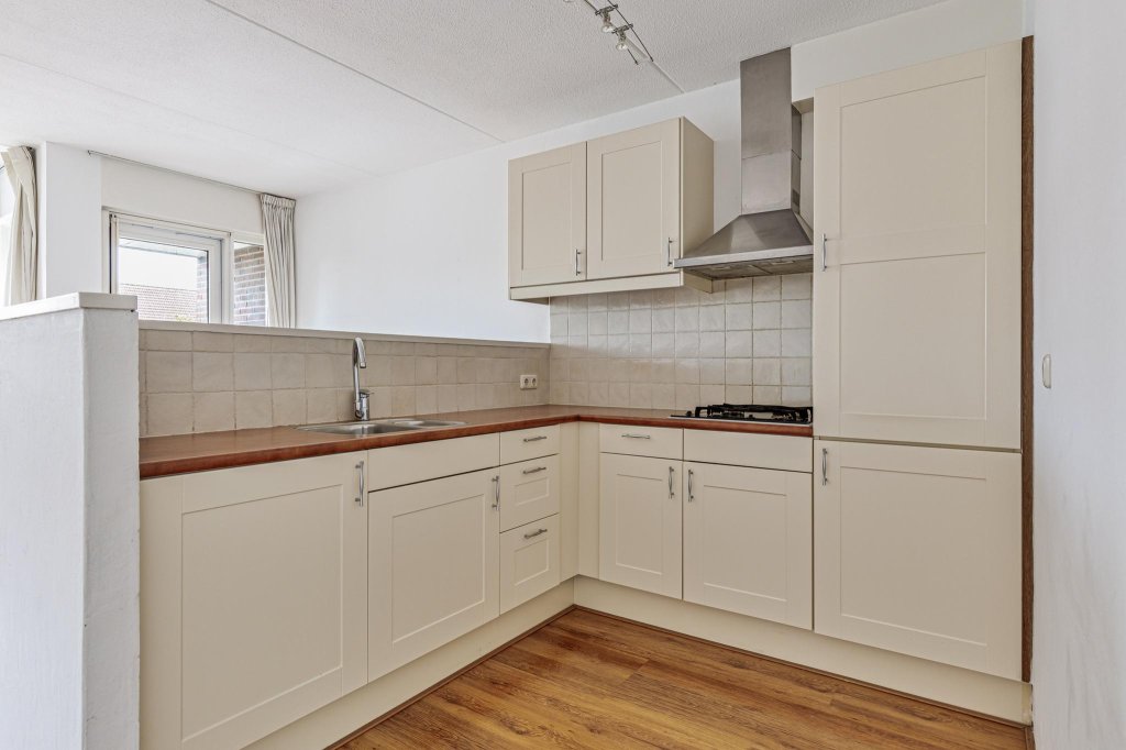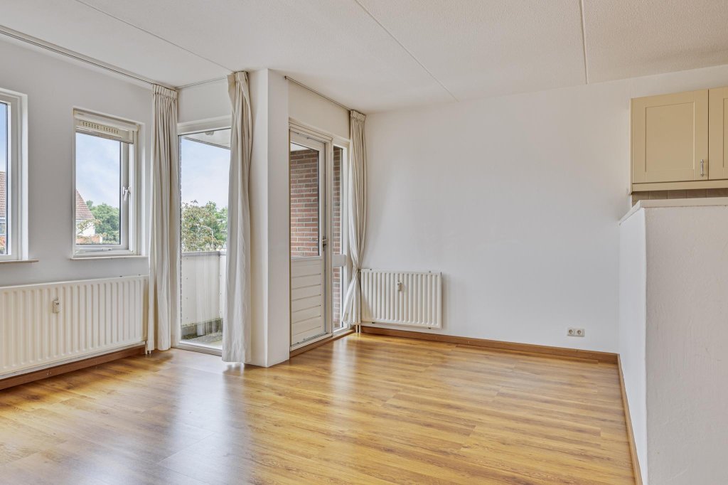 entree/hal, garderobe, meterkast, slaapkamer met vaste kastenwand, luxe badkamer met toilet, douche, wastafel, wasmachineaansluiting en handdoekradiator, keuken met 4-pits gasfornuis, afzuigkap en koelkast en toegang tot het balkon met uitzicht op de straat, bushalte en winkelcentrum.