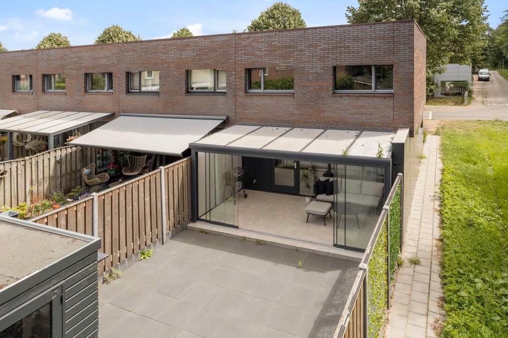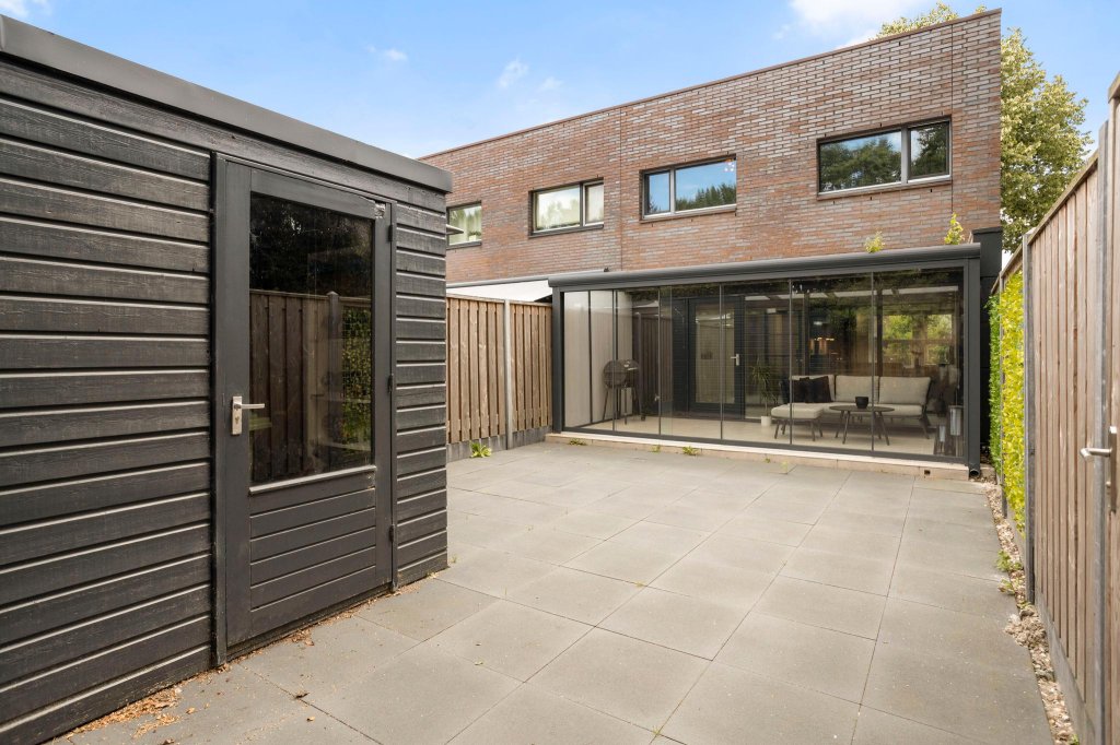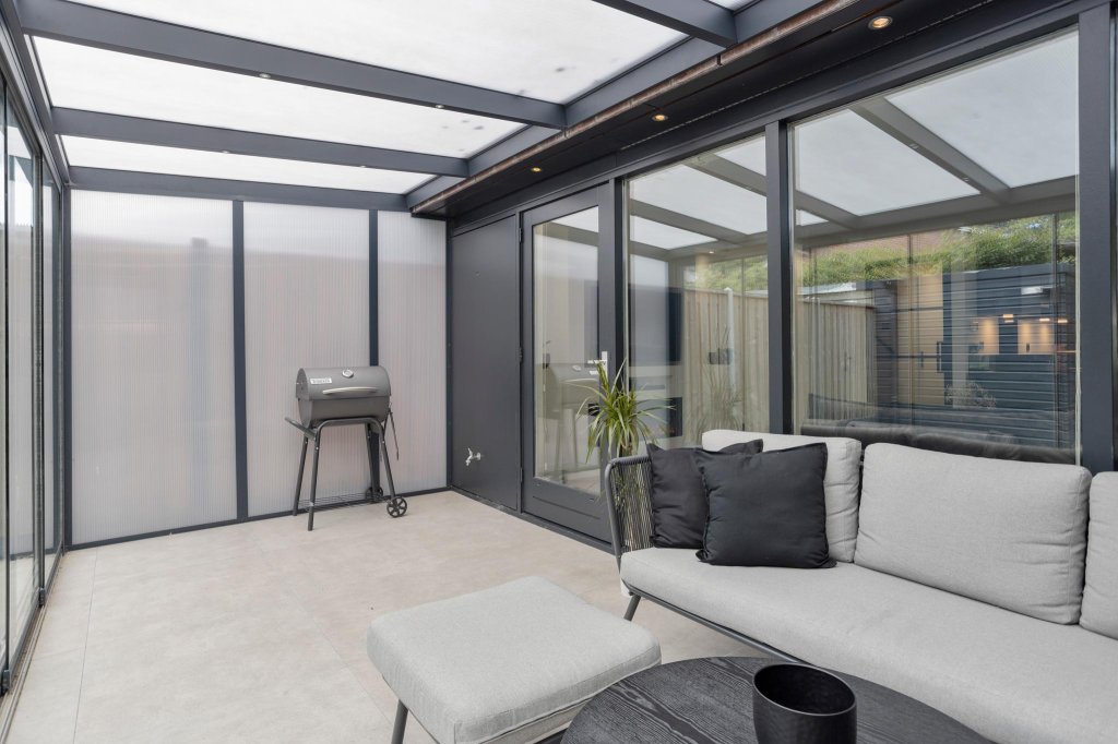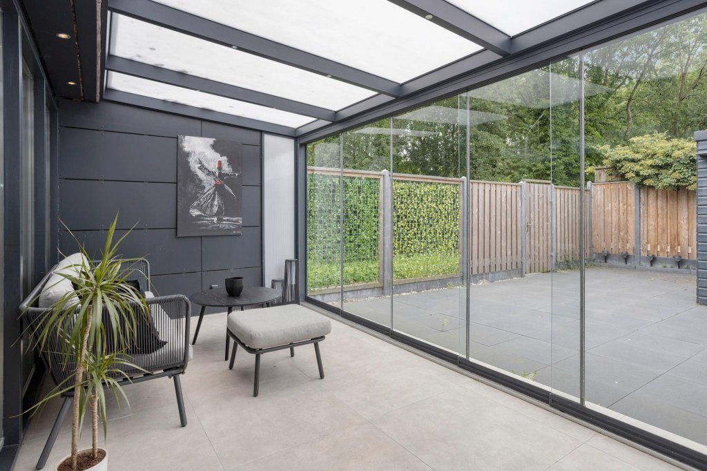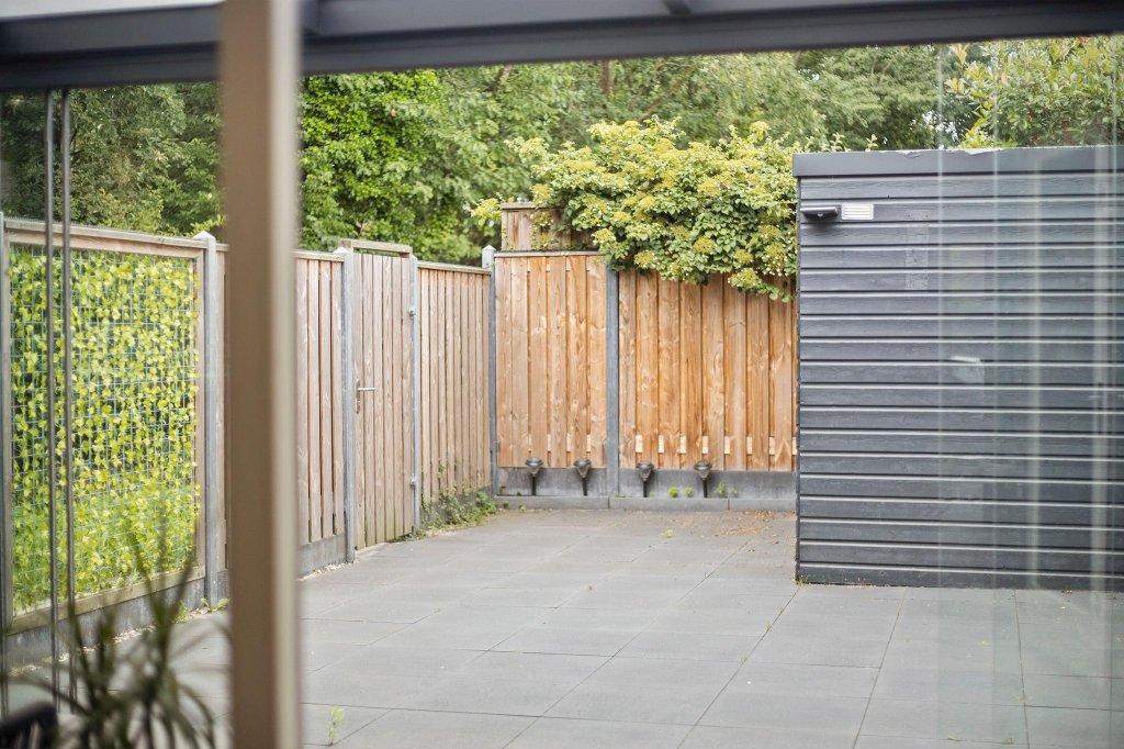 Onderhoudsvriendelijk tuin met af te sluiten bijzonder fraaie serre en achterom.
