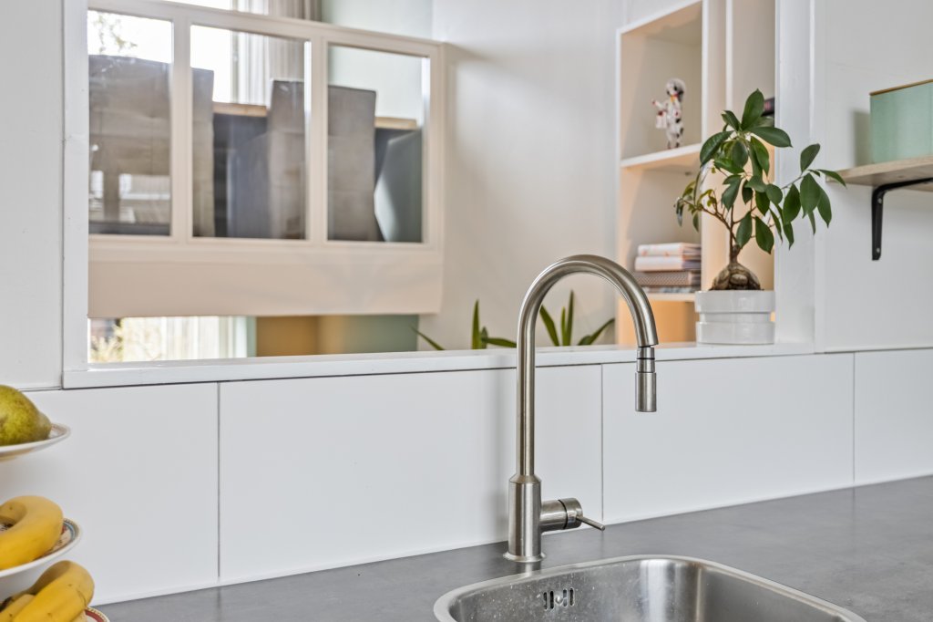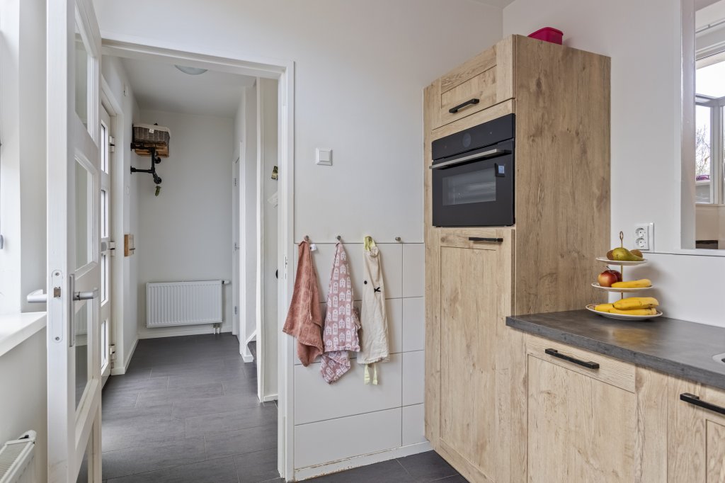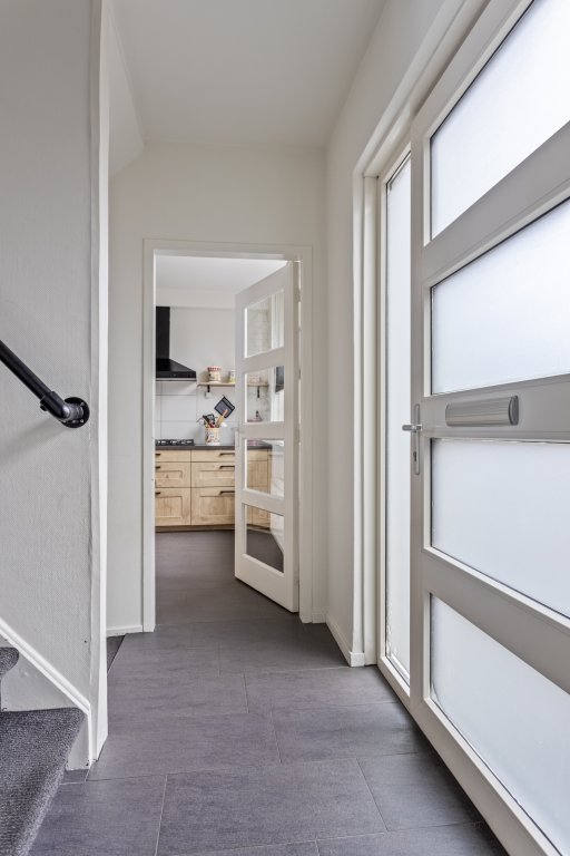 Hal/entree met aan de linkerzijde toiletruimte en aan de rechterzijde de keuken, deze is voorzien van diverse inbouwapparatuur en doorkijk naar de woonkamer. Via een trapje naar beneden (souterrain) bereikt u de sfeervolle ruime woonkamer met openhaard In de bijkeuken bevinden zich aansluitingen voor wasmachine/droger, extra kraan en een net werkblad + extra opbergruimte. Vanuit de woonkamer komt u in de mooi aangelegde achtertuin met een ruime tuinkamer en terras onder het balkon.