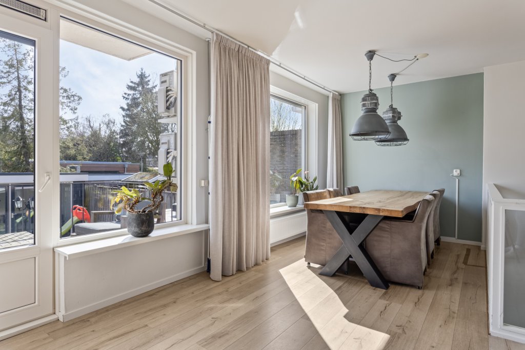 Via de hal op de begane grond gaat u een verdieping omhoog alwaar u de eetkamer bereikt welke in directe verbinding staat met de keuken en woonkamer d.m.v. een vide. De eetkamer geeft tevens toegang tot het dakterras.