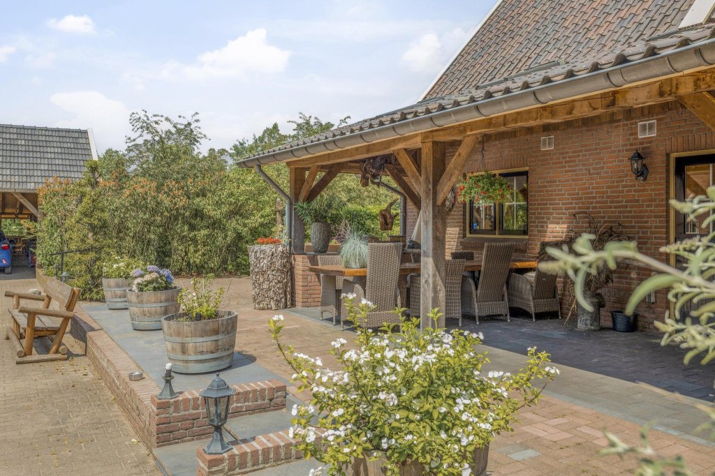 Op het perceel is een groot eigen bos met een honden- en kippenhok. Tevens is een ruime overkapping geplaatst om uw auto of caravan droog te zetten. De tuin is zeer fraai aangelegd en heeft een dubbele oprijlaan zodat u aan beide kanten kan op- of afrijden. De wei die om de woning heen ligt is in eigendom en kan optioneel worden overgenomen.
